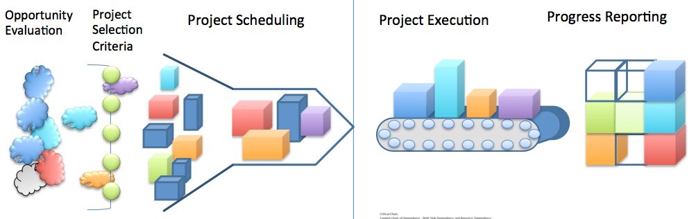 Predicting Resource Requirements, Quoting Reliable Delivery Dates, Tracking Cost and Revenue and Reports for all levels of the organization as a package of PMO Tools.