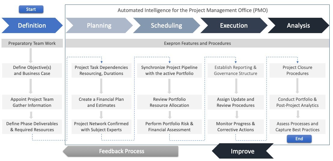 Exepron has packaged and automated the PMO Intelligence, to Plan, Schedule, Execute, Analyze and Improve a portfolio of projects.