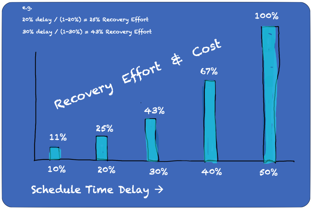 This is why the financial impact of delay accelerates so rapidly. The recovery effort must grow faster than the delay itself because the opportunity loss compounds daily.